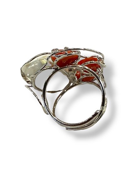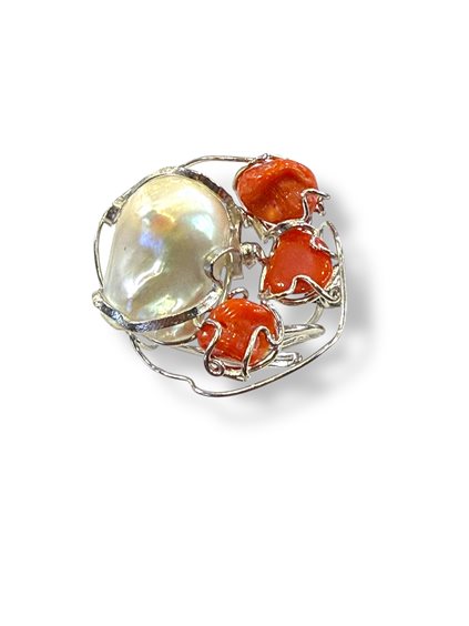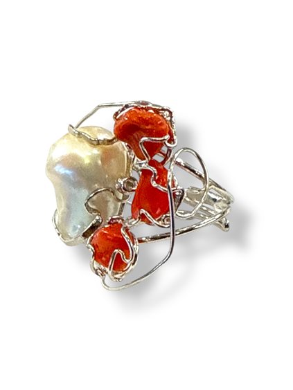 Anello in argento 925, lavorazione artigianale fatta a mano con incastonati tre coralli rossi ed una grande perla barocca. Anello regolabile, misura 13 ~ 20. Piccole imperfezioni che possono essere visibili non devono essere considerate difetto ma peculiarità delle pietre naturali e della lavorazione artigianale.