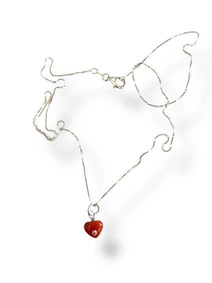 Collana in argento 925 con cuoricino di corallo rosso con piccola pietra da un lato. Lunghezza collana cm 45.