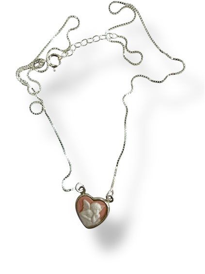 Collana in argento 925 con cuoricino di cammeo rosa figura Angelo. Lunghezza collana cm 43 + 3.