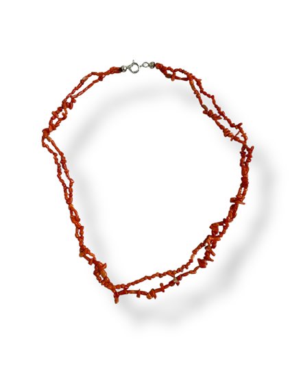 Collana 2 fili in corallo rosso naturale a frange, rametti. Chiusura in argento 925 Lunghezza collana 40 cm Le foto rappresentate sono indicative gli articoli naturali lavorati a mano possono avere delle lievi differenze per forma e colore.