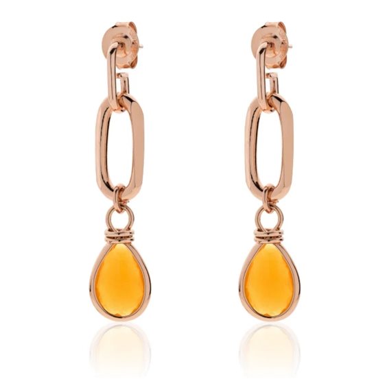 orecchini di catena forzatina allungata in bronzo con bagno in oro rosa 24 kt e pendente con cristallo ambra sfaccettato. Decisamente d'effetto, questi orecchini in catena grazie alla meravigliosa ambra darà colore e luce unica al tuo stile quotidiano. Concediti il lusso di osare ed abbinala a collana e bracciale. Materiale: Bronzo Colore: Rosa Pietra: cristallo color ambra Bagno galvanico: oro rosa 24 kt Finitura: lucida